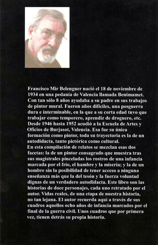 Fran Mir Belenguer se adentra en la literatura con una compilación de relatos basada en su dura infancia y juventud de posguerra. En estas páginas se despliegan doce relatos de personajes junto con sus retratos basados en sus recuerdos. Doce vidas reales que marcaron una etapa de su vida. Doce cuadros que tienen tras de sí una historia, su propia historia, retratada y escrita por el autor.